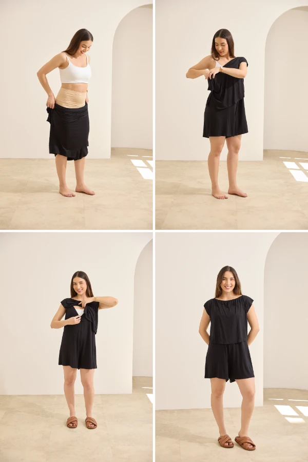 O segredo é escolher um modelo com tecido confortável, cintura que não marque e, se possível, algum detalhe funcional para o pós, tipo transpasse ou abertura que facilite a amamentação.