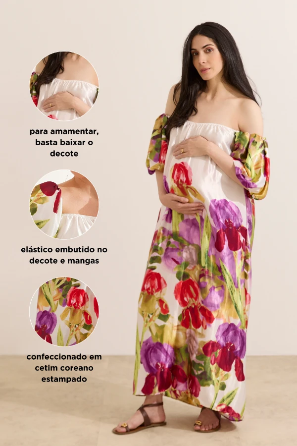 Vestido estampado em cetim para gestante e amamentação, ideal para chá de bebê